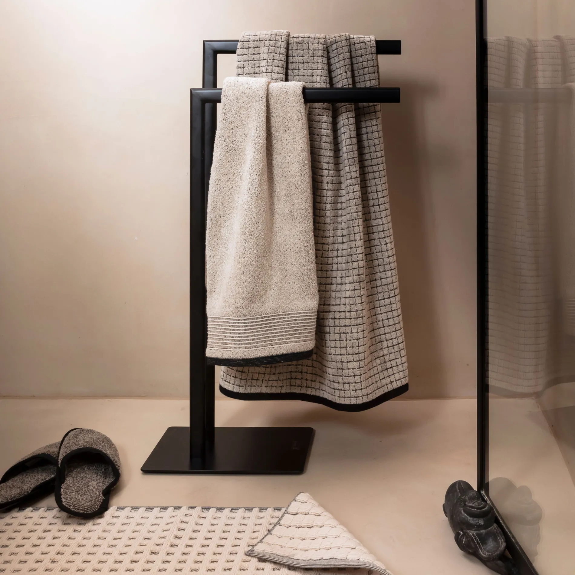 Der stabile Handtuchhalter aus der Kollektion möve VELVET verleiht Ihrem Bad einen modernen und edlen Look. Die zwei unterschiedlich hohen Arme sind an einem stabilen Standfuß befestigt, der ein Verrutschen auf dem Boden verhindert. Die Größe der Arme erlaubt das Trocknen von mehreren Tüchern gleichzeitig – das ist besonders praktisch, wenn es in Ihrem Bad keine anderen Möglichkeiten dafür gibt. Die hochwertige Verarbeitung und das mattschwarz beschichtete Metall erleichtern Ihnen die Pflege und Reinigung.