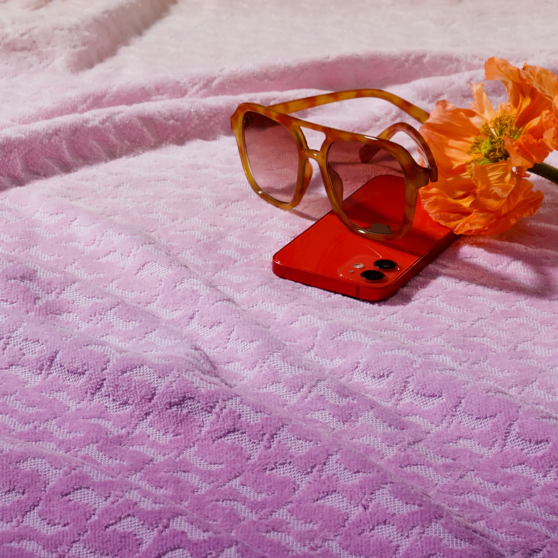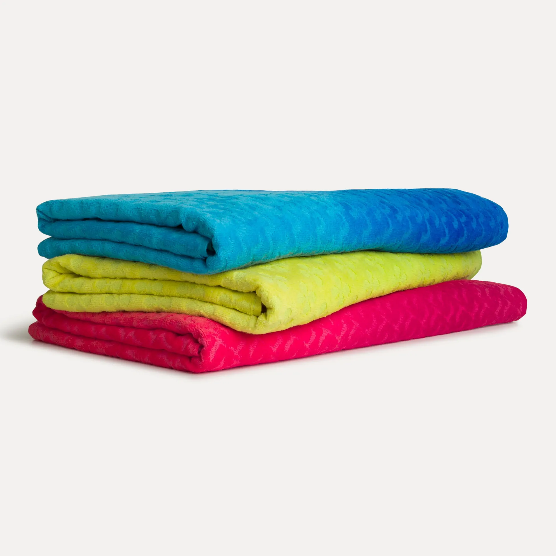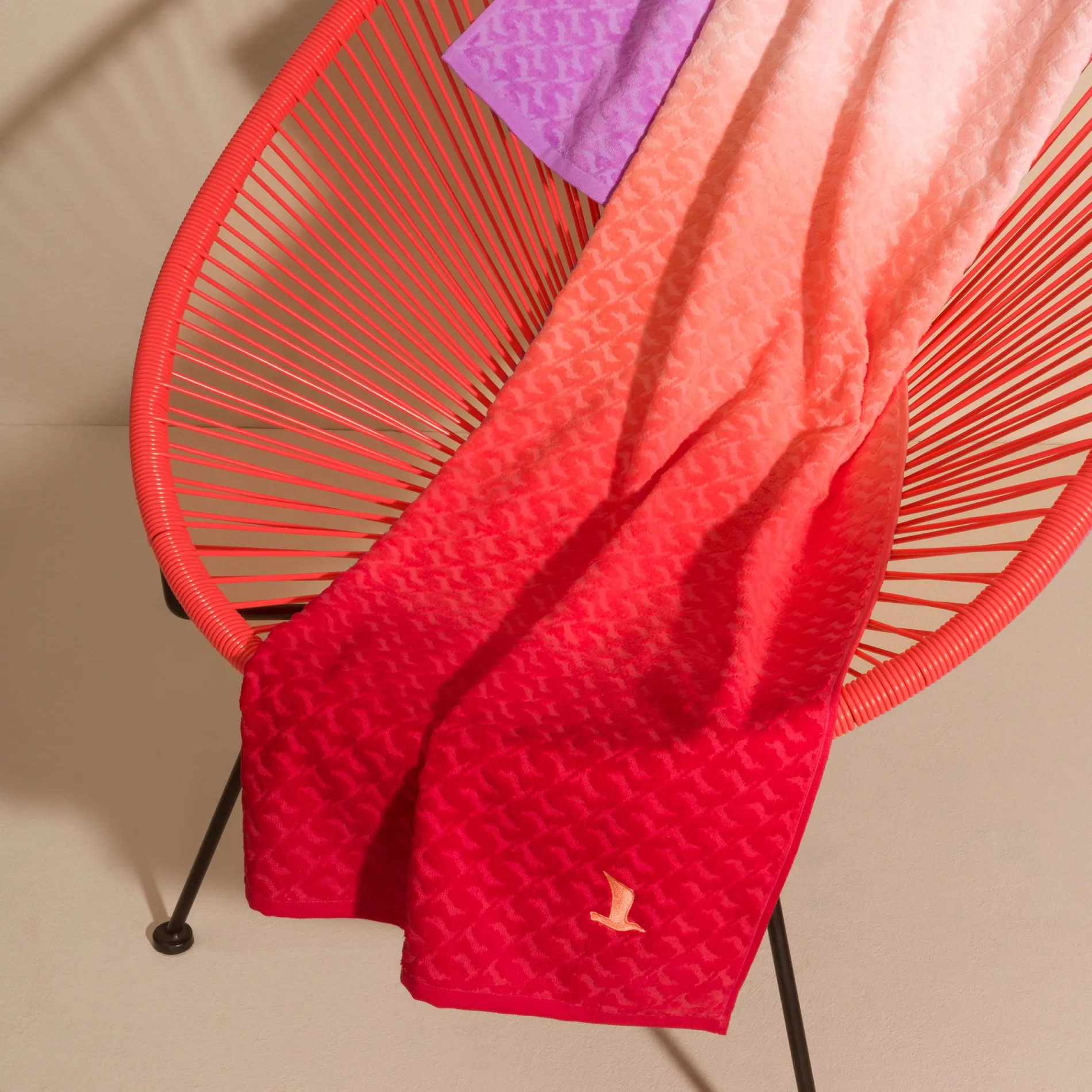 Ein optisches Highlight: der perfekt gedruckte Farbverlauf, der an einen Sonnenuntergang am Meer erinnert. Ergänzt wird das Design durch eine aufwendig eingewebte Hoch-Tief-Struktur in Form von Möwen, wie sie am Strand oft durch das letzte Sonnenlicht des Tages gleiten. Ein eingesticktes Signet rundet das Strandtuch stilvoll ab.