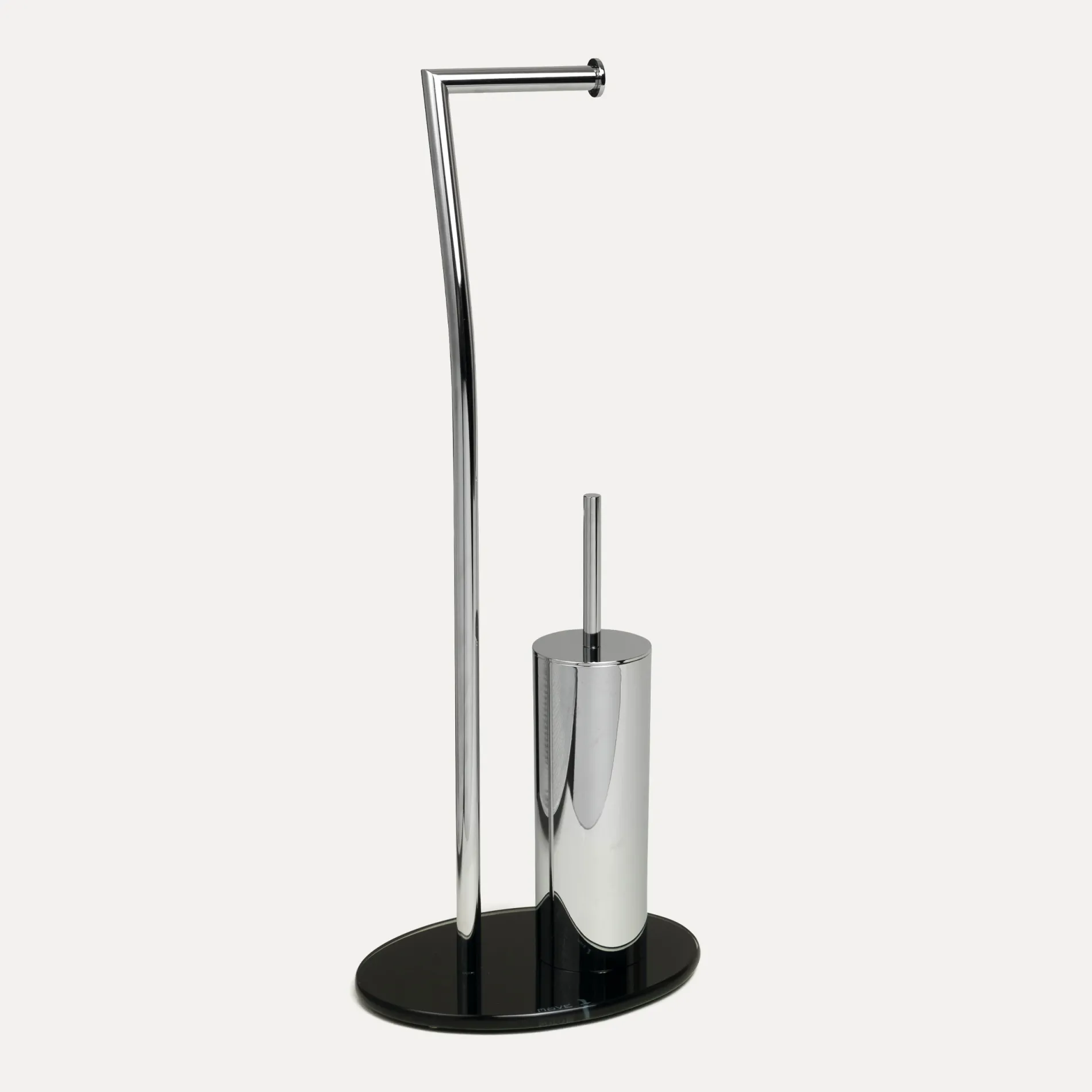 In der modernen Kollektion möve STAND verbinden sich Form und Funktion auf ideale Weise: Auf dem hohen, leicht gebogenen Toilettenpapierhalter findet eine Rolle Toilettenpapier ihren Platz, gleich daneben befindet sich die WC-Garnitur. Beide Teile sind fest verankert und können somit nicht verrutschen. Der schwarze, ovale Standfuß aus bruchsicherem Glas sorgt für einen sicheren Halt auf dem Boden und ist zudem leicht zu reinigen. Zusammen mit dem passenden Handtuchhalter geben Sie Ihrem Bad einen besonders dekorativen Look.