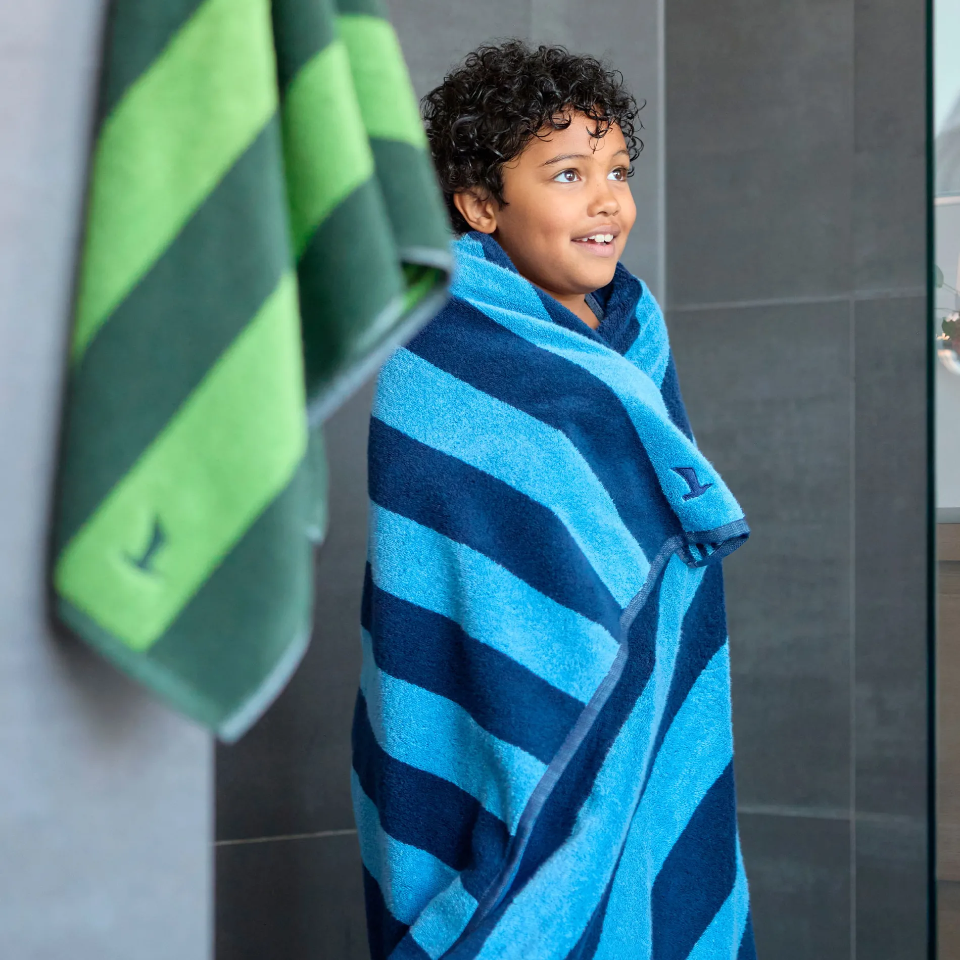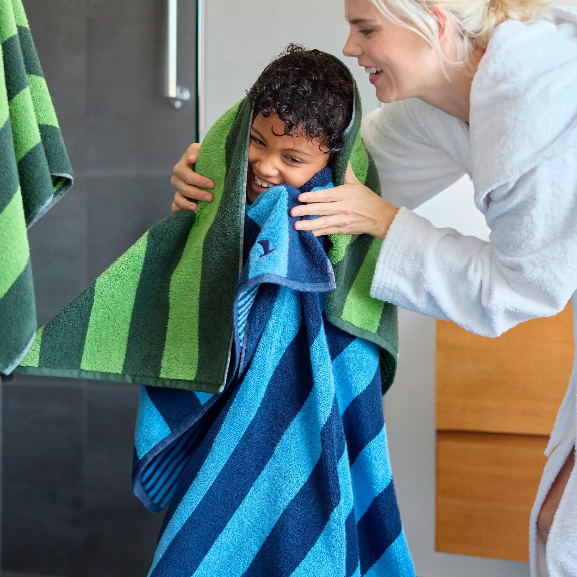 Mit der zeitlosen Kollektion SUPERWUSCHEL holen Sie sich maximales Volumen und höchste Saugfähigkeit ins Bad. Jetzt bekommt die Kollektion farblichen Zuwachs: Die Doubleface – Handtücher (50×100 cm) im markanten Streifendesign eignen sich perfekt zum Kombinieren mit den Unis und bringen einen frischen und angesagten Look ins Badezimmer. Dank speziell behandelter Premium Baumwolle sind sie besonders weich, flauschig und pflegeleicht – ideal also für den täglichen Einsatz. Der umgelegte Saum und das eingestickte Signet sind liebevolle Details, die das Handtuch zu einem echten Hingucker machen.
